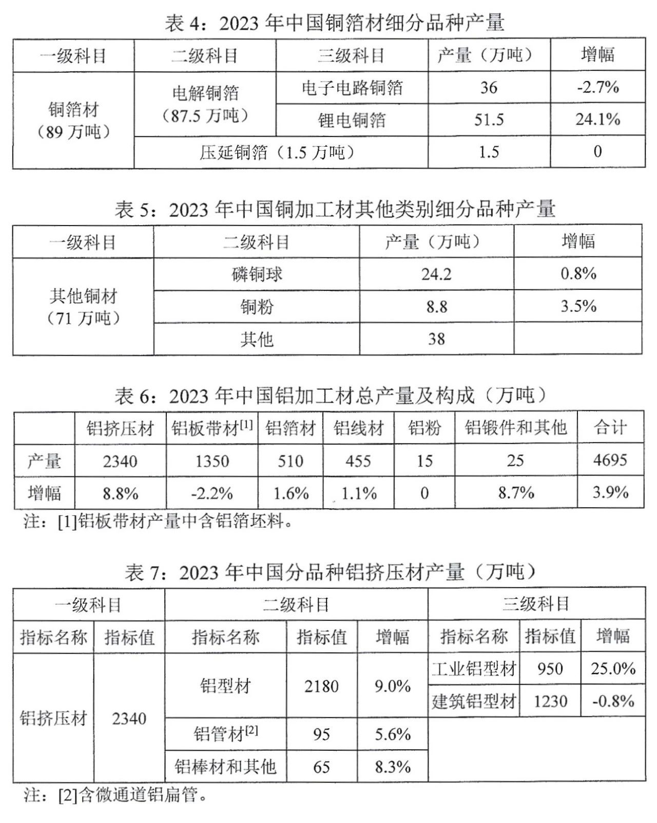 2023年,中國(guó)銅加工材綜合產(chǎn)量為2085萬噸,比上年增長(zhǎng)3.0%。鋁加工材綜合產(chǎn)量為4695萬噸,比上年增長(zhǎng)3.9%,其中剔除鋁箔坯料后的鋁加工材產(chǎn)量為4115萬噸,比上年增長(zhǎng)4.2%。銅鋁加工材細(xì)分品種產(chǎn)量和鋁擠壓材表面處理方式構(gòu)成詳見下表1至表11。